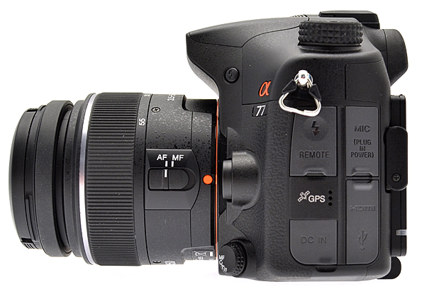 Il lato destro della macchina ospita il solo slot per la scheda di memoria SD o Memory Stick: Sony ha scelto uno slot singolo, in molti però avrebbero preferito un doppio slot. Il lato opposto è invece molto ricco di sportelli in gomma, i quali danno accesso al jack da 3,5mm per l'utilizzo di un microfono esterno, ai connettori HDMI e USB, al connettore di alimentazione elettrica e ai connettori per flash esterni e remote control. Tra i connettori trova spazio anche il ricevitore GPS.