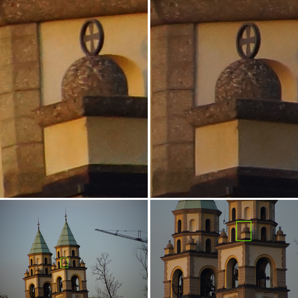 L'immagine normale e quella scattata con la funzione teleconverter 2x: il dettaglio al 100% rende evidente che si tratta solo di un crop
