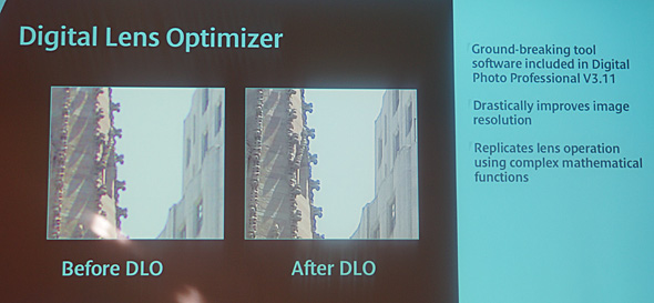 Con la nuova macchina Canon aggiorna anche il software di gestione e sviluppo Digital Photo Professional, che raggiunge la versione v3.11. Novità di questa versione è Digital Lens Optimizer (DLO), tecnologia che simula con precisione il funzionamento dell'obiettivo con una serie di complesse funzioni matematiche che replicano ogni stadio del percorso della luce attraverso le lenti. Usando queste informazioni, DLO può correggere una serie di aberrazioni ottiche tipiche, e migliorare la percezione del minor dettaglio dovuto alla presenza del filtro passa basso: in questo è evidente la pressione messa a Canon da parte di Nikon e della sua nuova Nikon D800, resa disponibile anche in versione senza filtro anti-aliasing.