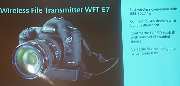 Nuovo anche il trasmettitore wireless Wi-Fi Canon WFT-E7: oltre al Wi-Fi offre anche supporto per la connettività cablata Ethernet Gigabit. Grazie alla compatibilità 802.11a/b/g/n per velocità di trasferimento file fino a 150Mbps e Bluetooth per il collegamento a unità GPS esterne, WFT-E7 offre un trasferimento veloce delle immagini direttamente a un server FTP, oppure a smartphone, tablet o computer portatili oppure ancora anche a un HDTV compatibile DLNA. Anche in questo caso il prezzo rappresenta una bella barriera, con 860 euro IVA inclusa di listino.