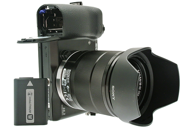 Sony ha fatto un ottimo lavoro sul fronte dell'interfaccia macchina-utente per questa sua NEX-7: le forme della fotocamera riprendono quanto già visto sulla serie NEX, con un corpo sottile nella parte centrale e una bugna pronunciata per l'impugnatura con la mano destra: quest'ultimo elemento è quello in cui trovano spazio anche, con accesso tramite sportello sul fondo, la batteria e la scheda SD/MS. L'impugnatura è ben sagomata sia nella parte anteriore, sia nel supporto gommato per il pollice sul lato posteriore.
