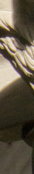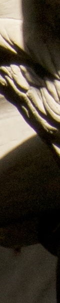 Uno scatto a 320 ISO e alcuni particolari al 100%: nell'ordine alto/basso, sinistra/destra, il file JPEG della macchina e diverse versioni del file RAW sviluppato con Adobe Camera RAW. Senza applicazione di filtri di contenimento del rumore, forzando la mano sul recupero delle ombre, uno sviluppo più equilibrato e quest'ultimo ulteriormente elaborato in Adobe Photoshop con lo strumento Ombre/Luci