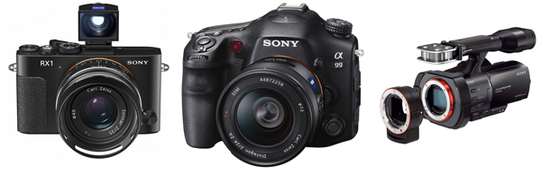 Sony ha messo sul piatto un terzetto di proposte Full Frame (basate sul sensore Exmor CMOS full-frame da 24,3 megapixel effettivi) qualche giorno prima dell'apertura di Photokina 2012, giocando d'anticipo sul resto della concorrenza. Due di esse sono molto particolari: la videocamera Sony NEX-VG900E pur adottando la baionetta della serie mirrorless APS-C NEX E-Mount integra un sensore 35mm e pari dimensione è anche quella del sensore della compatta a ottica fissa Sony Cyber-shot DSC-RX1. Si tratta di due prodotti che andranno a interessare una nicchia di utenti, mentre ha aspettative più di massa la simil-reflex SLT Sony Alpha A99, che va a posizionarsi al momento in cima alla gamma delle fotocamere a ottiche intercambiabili. Si tratta di un prodotto che prova a giocare fuori dagli schemi del duopolio Canon/Nikon, leader del segmento reflex e soprattutto di quello che utilizza sensori in formato pieno.