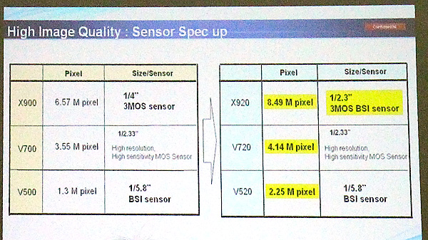 Il resto della nuova gamma vede nel settore delle videocamere tradizionali un aggiornamento dei modelli precedenti, con un'interessante upgrade per il modello di punta X-920. Se i modelli V720 e V520 aggiornano i precedenti V700 e V500 con una maggiore risoluzione del sensore, ma senza cambiarne il formato, la nuova X920 integra un sistema 3MOS BSI in formato 1/2,3", rispetto al simile sistema, ma in formato 1/4" del precedente modello X900.