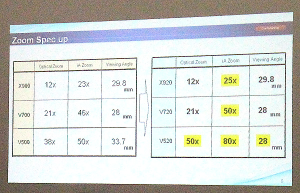 I nuovi sensori hanno permesso a Panasonic di allungare la portata dello zoom digitale in modalità iA Zoom: X920 e X720 mantengono l'ottica dei modelli precedenti, rispettivamente 12x a partire da 29,8mm e 21x a partire da 28mm, ma vedono lo zoom digitale arrivare a 25x e 50x. Per la nuova X520 cambia del tutto l'ottica: partendo da 28mm di focale minima equivalente offre zoom ottico 50x e digitale 80x.