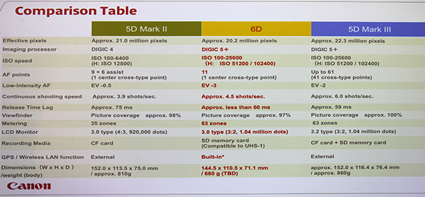 Canon EOS 6D primeggia tra le sorelle per la sensibilità dell'autofocus nel punto centrale a croce, sapendosi spingere fino a -3EV, contro -2 EV di MkIII e -0,5 EV di MkII. Rispetto alla sorella maggiore paga dazio sul fronte del numero di punti di messa a fuoco, che su Canon EOS 5D Mark III sono 61 di cui 41 a croce. Rispetto alla Mark II si comporta molto bene con 11 punti di cui il centrale a croce contro i 9+6 (questi ultimi di 'assistenza') di cui il centrale a croce, per altro, come detto, meno sensibile in condizioni di scarsa illuminazione. Canon EOS 6D è l'unica delle tre a offrire GPS e Wi-Fi integrati, una caratteristica che l'avvicina al pubblico consumer, assieme al peso di soli 680 grammi, contro gli 810 e 860 grammi delle 5D.