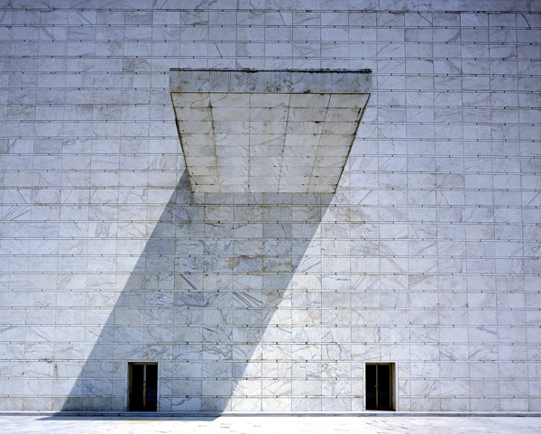 Lo scatto di Martina nasce da un progetto sull'architettura fascista all'EUR di Roma, una serie di immagini nata per una mostra con altri giovani fotografi sullo stile della scuola di Düsseldorf, molto attento al tema della prospettiva. Per meglio cogliere l'essenza del palazzo ritratto e del particolare effetto dell'ombra pomeridiana, Martina ha scelto il banco ottico con lastra fotografica, cercando di trovare la massima inclinazione per correggere la divergenza delle linee verticali. La presenza di un muro alle spalle non ha permesso di arrivare alla correzione totale (visibile in parte nelle linee vertcali più esterne nella parte in alto), ma il risultato finale è certamente di pregio.