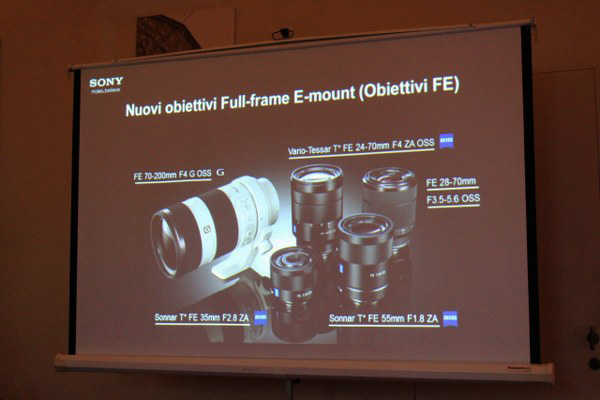 Ma la vera novità sta nelle nuove ottiche full frame con attacco E-Mount: alla sua uscita le due fotocamere potranno essere accompagnate subito da due nuove ottiche: uno zoom stabilizzato (non c'è stabilizzatore sul sensore) 28-70mm f3.5/5.6 OSS che sarà fornito in kit con Sony A7 e il focale fissa ZEISS Sonnar 35mm F2.8, probabile prima scelta per chi acquisterà A7r, che verrà venduta solo in versione corpo. A gennaio sono poi in arrivo uno zoom stabilizzato ZEISS Vario-Tessar 24-70mm F4 OSS e il focale fissa ZEISS Sonnar 55mm F1.8. Per il mese di aprile invece è programmato il telezoom Sony G 70-200mm F4 OSS.