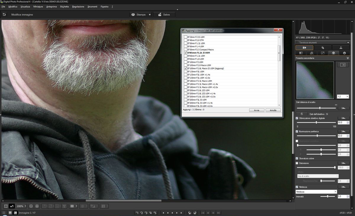 Va da sé, le ottiche EF sono ampiamente supportate, con anche combinazioni tra ottiche e moltiplicatori di focale per i modelli che li supportano. Abbiamo notato con piacere la presenza di profili per importanti ottiche che, nelle versioni 3.x, erano state trascurate, come il 135mm f/2; l'attenzione non è stata comunque rivolta solo alle ottiche più pregiate: per fare un paio di esempi, sono ora disponibili i profili del 50mm f/2.5 Compact Macro e dell'85mm f/1.8. Assente invece, probabilmente perché i modelli attualmente supportati da DPP 4 sono tutti Full Frame, qualsiasi obiettivo EF-S.