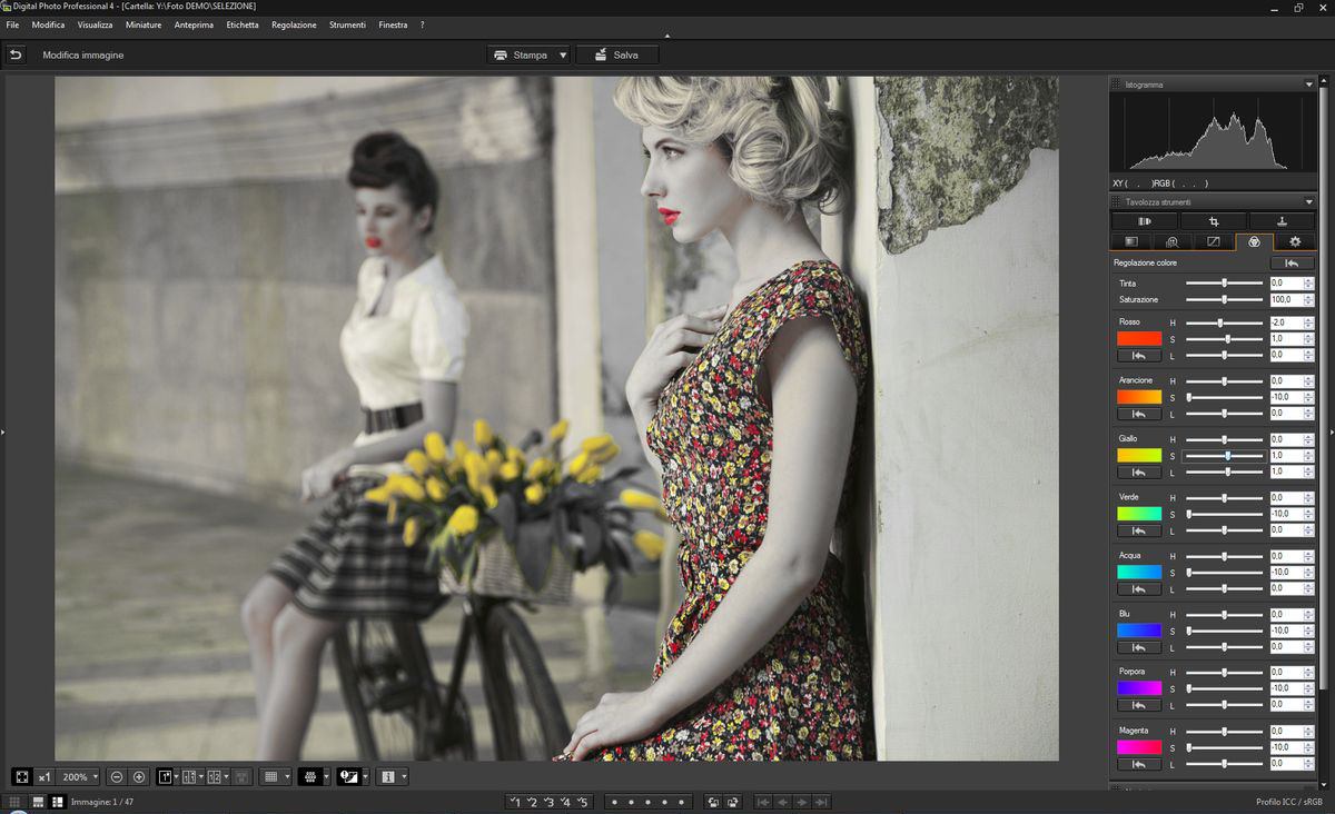 Troviamo, a seguire, la regolazione della curva di contrasto e la scheda HSL, principale novità a livello di strumenti offerti da DPP 4, che come noto consente di variare tinta, saturazione e luminosità di 8 colori base (utile ad esempio per rendere il cielo di un blu più saturo, per sottolineare un particolare aumentandone la saturazione o per creare immagini in bianco/nero selettivo).