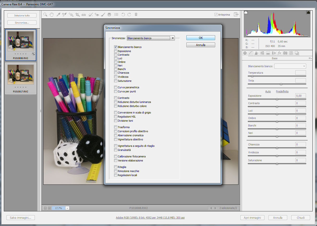 Quando si scatta una serie di immagini nelle stesse condizioni di luce, è possibile curare il bilanciamento del bianco della prima immagine della serie (dove magari è stato inserito un cartoncino grigio neutro di riferimento) e applicare le stesse regolazione a tutte le successive. Dopo aver regolato la prima immagine, basta selezionare le successive (CTRL + Click o SHIFT + Click sull'ultima immagine), premere il pulsante Sincronizza e scegliere dalla finestra di dialogo quali impostazioni copiare, in questo caso il bilanciamento del bianco.
