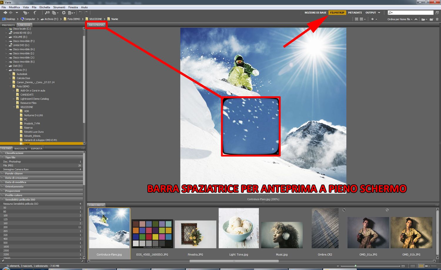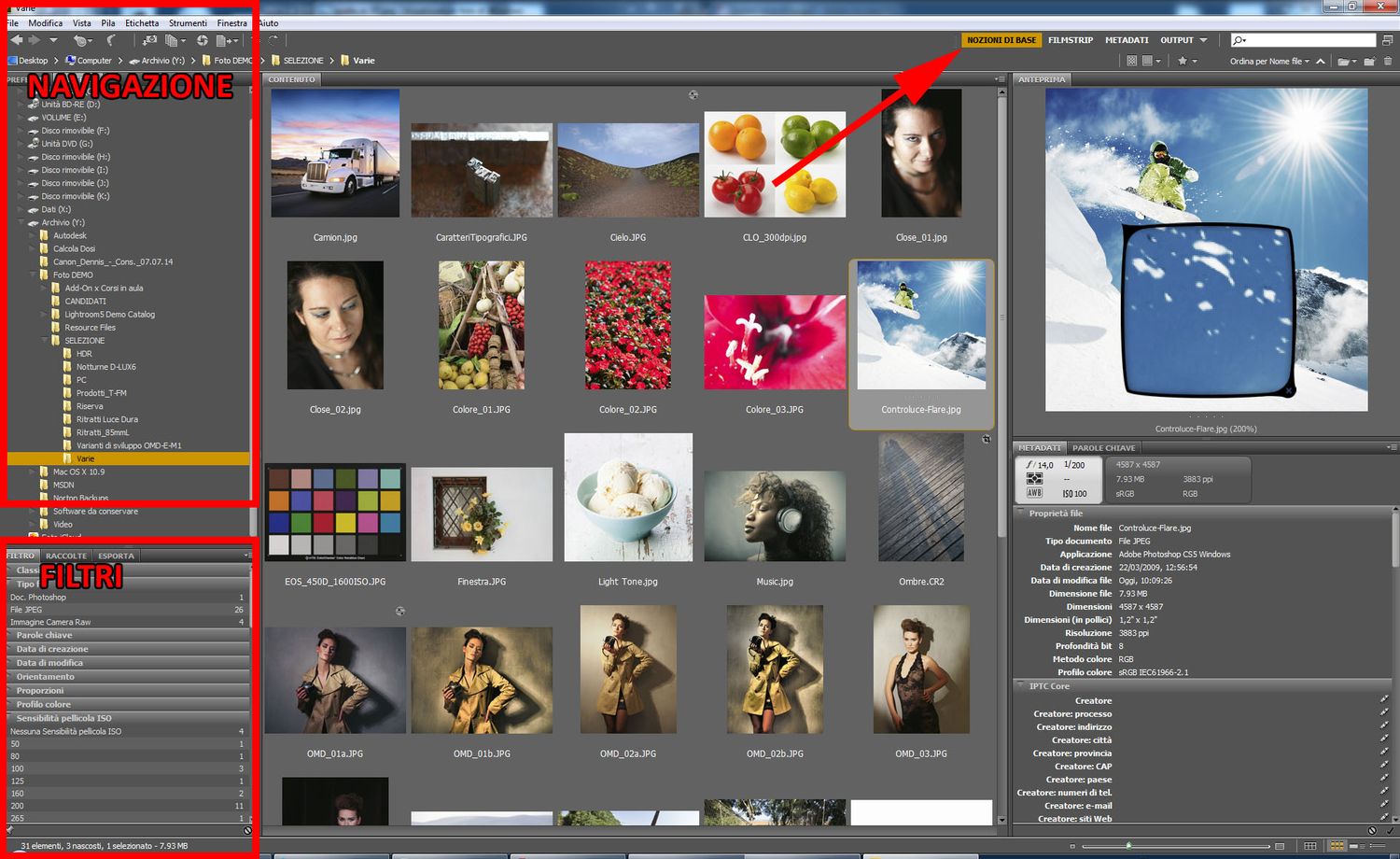 A sinistra si trovano gli strumenti di navigazione veri e propri, tra cui i filtri basati su metadati; consentono di selezionare, ad esempio, tutte le immagini prodotte a un certo valore ISO o tutte quelle scattate con un certo obiettivo. In alto a destra è possibile scegliere la modalità di navigazione (Nozioni di base e Filmstrip sono, probabilmente, le più utili per il fotografo, ma ne esistono diverse altre (CTRL + F1-F6).