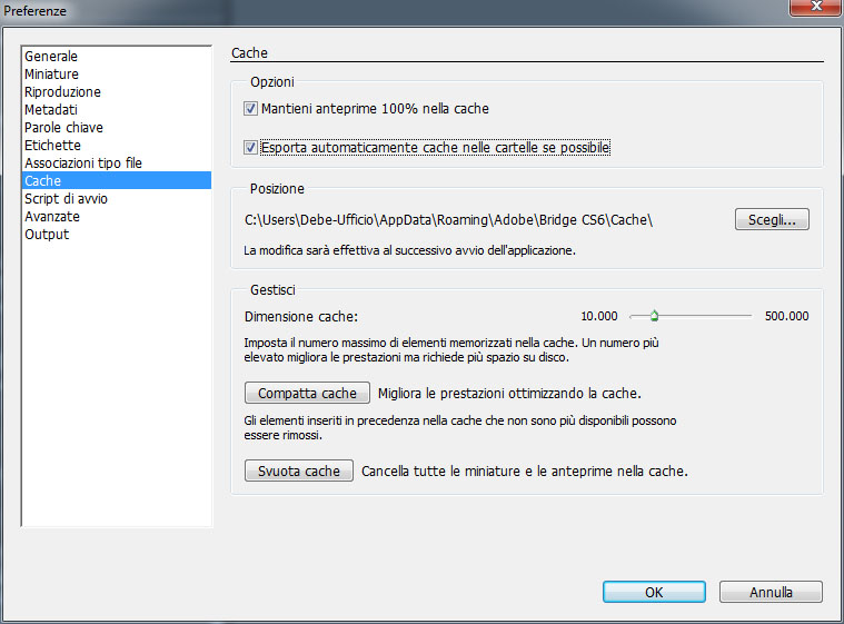 Chi decide di usare costantemente Bridge troverà utile ottimizzare la cache (Modifica > Preferenze). Ovviamente, maggiore lo spazio dedicato alla cache, maggiori saranno le performance.