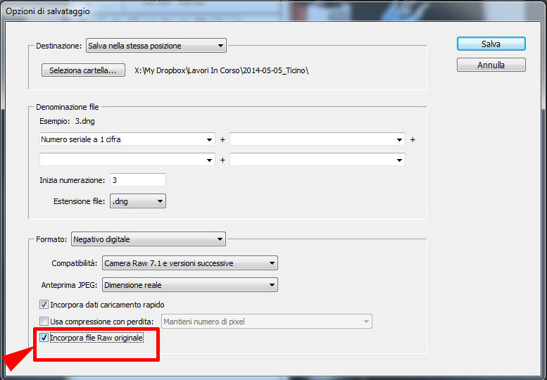 Da notare che, durante la conversione da RAW proprietario a DNG, è possibile impostare il software in modo che il DNG includa ANCHE il RAW proprietario originale (ad esempio il .CR2 di Canon o il .NEF di Nikon). Questo è, per ovvie ragioni di spazio, vivamente sconsigliato.