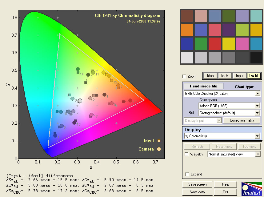 Vengono riportati gli errori cromatici dC94 e dE94, che richiedono una piccola spiegazione. Facendo riferimento allo spazio colore CIE 1976 (detto anche Lab o L*a*b), in cui a e b rappresentano gli assi cartesiani colore-opponente e L rappresenta l'asse verticale Luminosità (luminanza), esistono varie formule per calcolare l'errore cromatico. La più semplice e più diffusa, nota come "ab" è banalmente il calcolo della distanza geometrica tra due punti del piano a*b o dello spazio 3D L*a*b. Avremo allora un errore dC(ab) che si riferisce alla distanza in linea retta tra due punti del piano a*b e un errore dE(ab) che misura la distanza in linea retta tra due punti dello spazio tridimensionale L*a*b. Purtroppo, nonostante le buone intenzioni dei creatori dello spazio CIE 1976, tale errore "euclideo" non corrisponde perfettamente all'errore percepito dall'occhio umano, e questa è la ragione che ha portato all'introduzione di nuove formule di calcolo. Noi utilizziamo, come detto, dE94 e dC 94. Entrare nei dettagli di questa formula è inessenziale per i nostri scopi. Ciò che è importante sottolineare è: