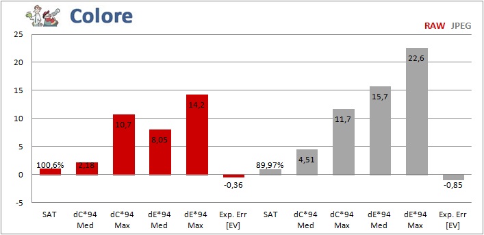 Oltre agli errori cromatici, questa sezione include una misura di saturazione (100% sarebbe il risultato perfetto, ma tipicamente le fotocamere - specie i modelli consumer - vanno decisamente oltre) e di errore di esposizione espresso in termini di f/stop (EV).