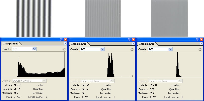 Tre esempi di target di frequenza spaziale crescente. L’istogramma mostra come, all’aumentare della frequenza spaziale, la differenza tra il livello massimo Lmax e quello minimo Lmin dell’immagine si riduca progressivamente.