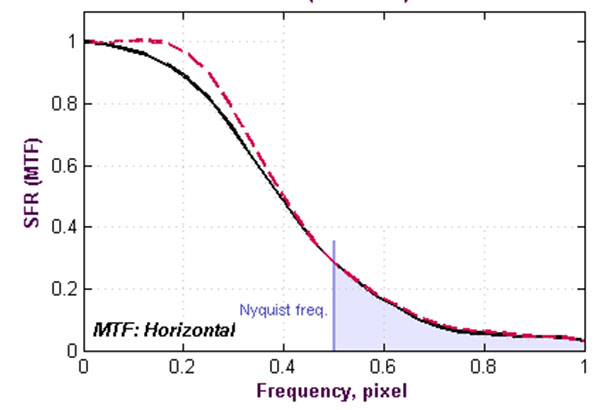 Un esempio di curva MTF, espressa in funzione di cicli per pixel. 0,5 cicli/pixel è, per cosiddetto "teorema del campionamento", il massimo valore misurabile.