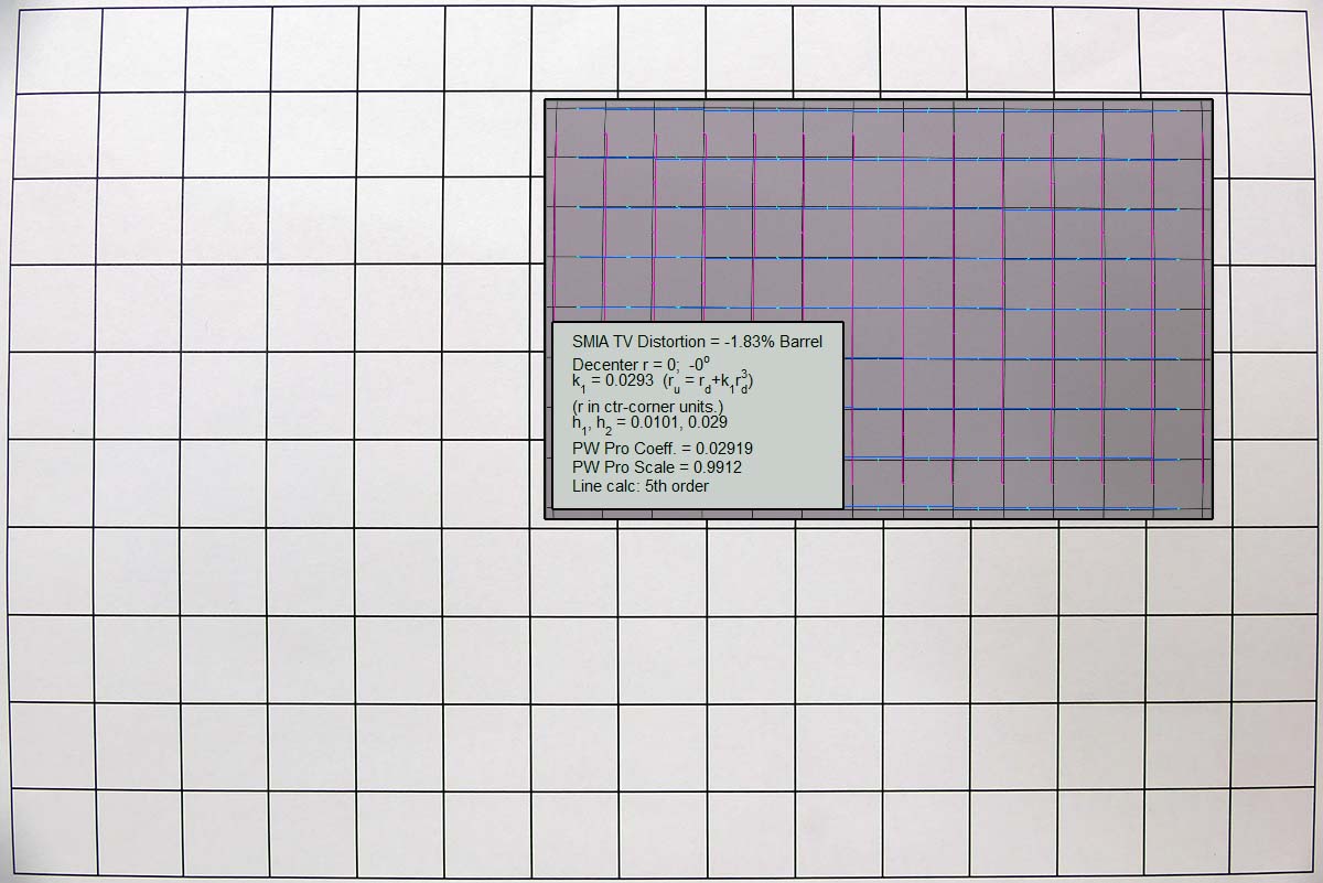 La peggiore condizione di distorsione (25mm equivalenti), -1,83% - barilotto - è da considerarsi comunque contenuta, e viene facilmente corretta già in-camera.
