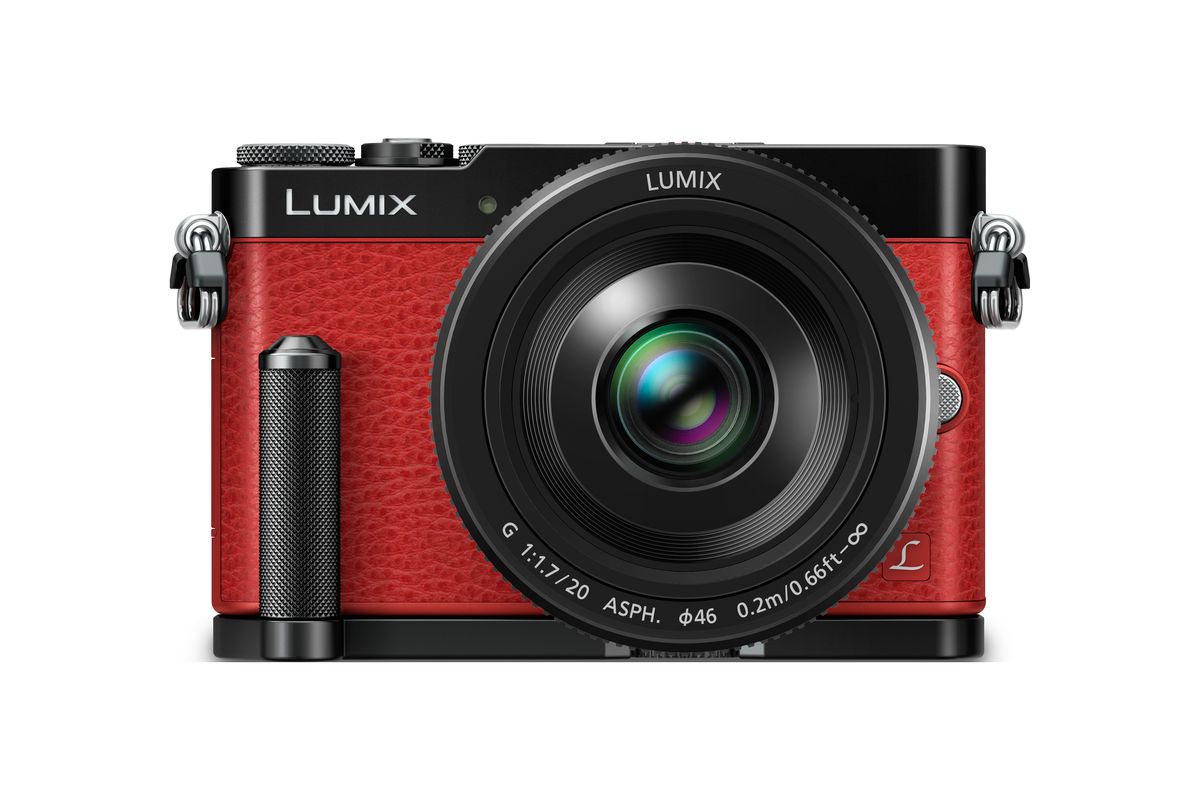Lumix GM5, versione rossa, con impugnatura opzionale e obiettivo 20mm. Per la GM1/GM5, sono stati studiati appositi obiettivi particolarmente compatti, come il 12-32mm e i nuovi 15mm e 35-100mm, che verranno tutti proposti in tre diversi kit con la fotocamera (solo 12-32mm, solo 15mm, 12-32mm + 35-100mm).