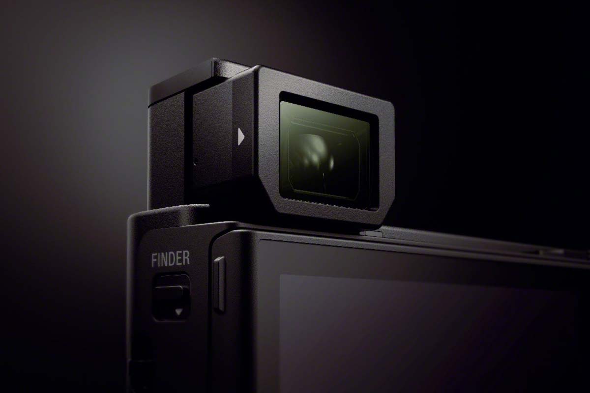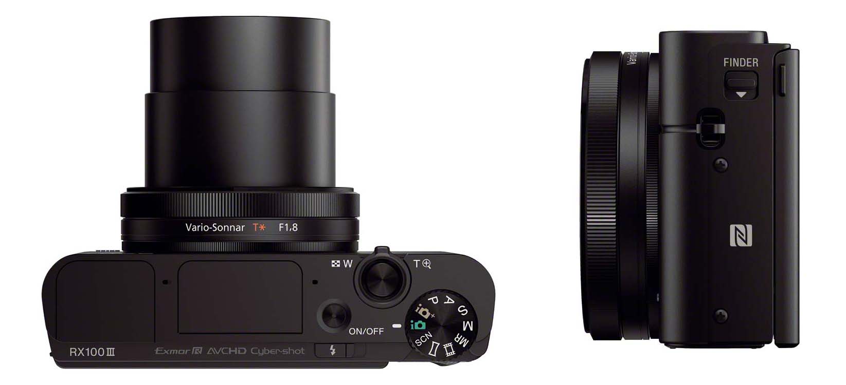 La parte superiore mostra la prima importante novità, che è anche una caratteristica distintiva di questo modello: il mirino elettronico a scomparsa. Come un flash, il mirino della RX100 III emerge a richiesta, quando si desidera lavorare con un'impugnatura più stabile a braccia raccolte oppure quando il display posteriore risulta poco leggibile, e scompare discretamente quando la sua presenza non è più richiesta.