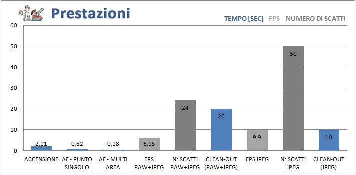 Il tempo di accensione è nella media. Non particolarmente rapida la messa a fuoco a punto singolo, e i 10 fps promessi si sfiorano solo in formato JPEG. Complessivamente, comunque, le prestazioni sono da considerarsi buone tenuto conto della tipologia di fotocamera. Molto buona, in particolare, la durata della raffica (anche in formato RAW).
