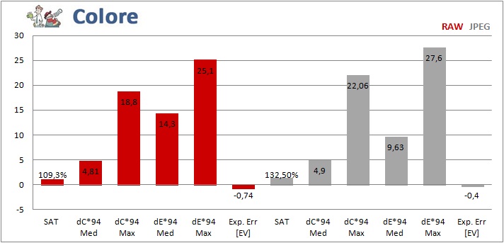 Nella media il comportamento cromatico. Il JPEG prodotto in-camera con impostazioni standard è estremamente saturo e di forte impatto - pronto per la pubblicazione online senza ritocco.