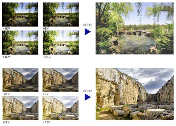 HDR. Disponibile una completa funzione HDR con due opzioni predefinite (HDR1, per un look naturale, o HDR 2 per un effetto più esasperato) e 5 opzioni manuali, con scelta del numero di scatti tra 3, 5 o 7 e bracketing di 2 o 3 EV.