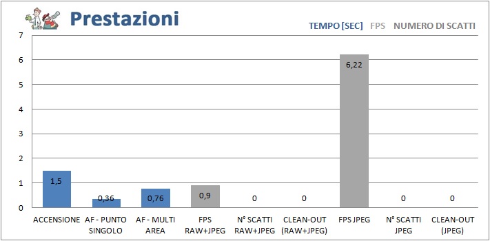 Il tempo di accensione è ridotto, così come il tempo di messa a fuoco nella grande maggiornaza dei casi comuni. Il frame rate dichiarato è raggiungibile solo in JPEG, mentre passando al formato RAW la cadenza di scatto crolla nell'intorno del singolo fps. Il numero di scatti consecutivi è tanto elevato da poter essere considerato infinito, ma è una magra consolazione.