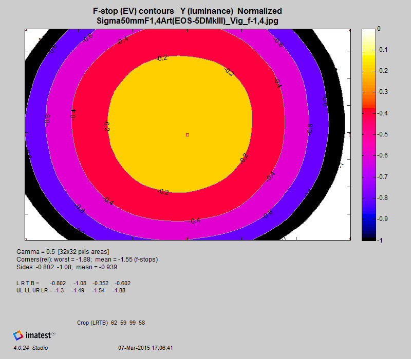La vignettatura del Sigma è piuttosto evidente a f/1.4, apertura alla quale ai bordi si perdono quasi 2 f/stop. Basta però passare a f/2 per vedere il difetto ridursi fin quasi a scomparire. Di nuovo, lo Zeiss fa segnare valori simili ma leggermente peggiori, che non hanno un reale impatto sull'immagine finale ma che portano a chiedersi cosa esattamente giustifichi un esborso economico cinque volte superiore.