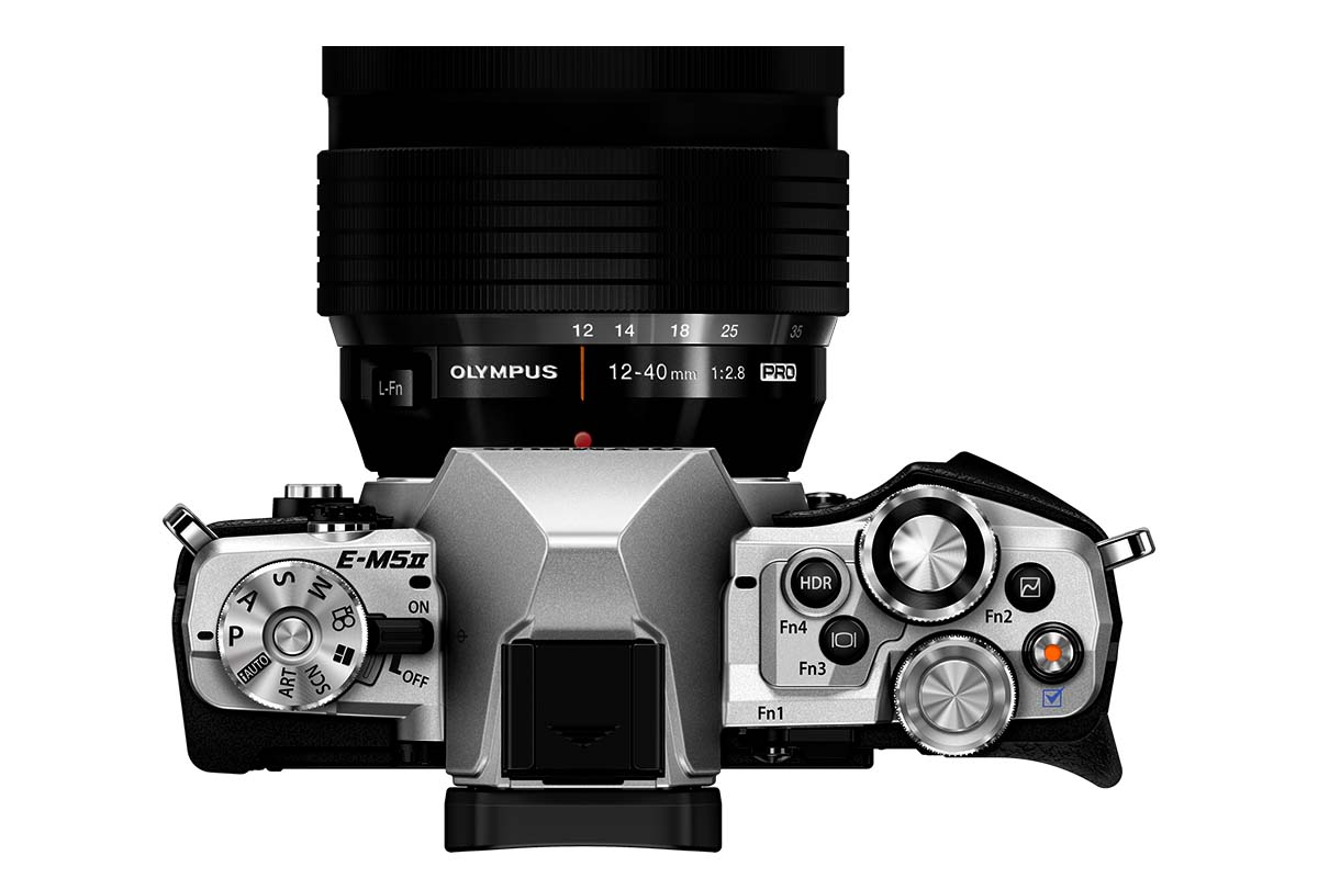 Il dorso si apre con il pulsante progammabile Fn1, intorno al quale si trova un selettore a due posizioni che, analogamente alla E-M1, raddoppia le funzioni delle due ghiere di comando, permettendo di associare a ciascuna due funzioni. Per impostazione predefinita, la ghiera frontale controlla la compensazione esposimetrica e quella posteriore il parametro libero (ad esempio il diaframma in priorità di diaframmi); portando il selettore in posizione 2, la ghiera frontale regola gli ISO e qulla posteriore il bilanciamento del bianco.