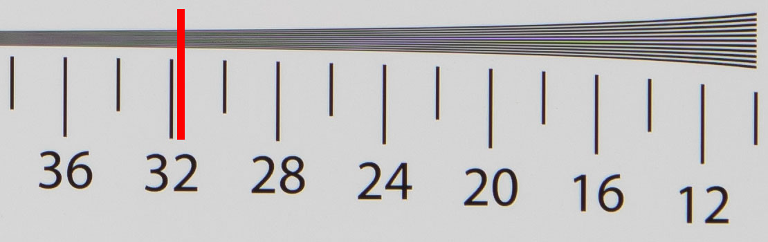 Il vantaggio della maggior risoluzione del sensore sulla nitidezza è chiaramente percepibile. Già il JPEG in-camera ottenuto con impostazioni standard fa registrare al centro del fotogramma circa 2900 LW/PH, dato concorde con l'esame visivo del target che mostra un'estinzione del pattern nell'intorno delle 2800 LW/PH.