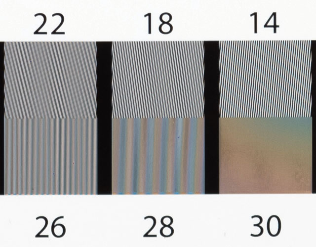 Fujifilm X-A2, Fujinon XF35mmF1.4 R, f/5.6, 200 ISO. Poco prima delle 3000 LW/PH si osserva la completa estinzione del pattern.