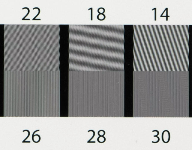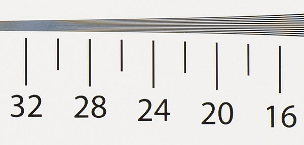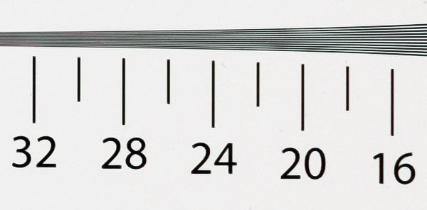 Fujifilm X-T1, Fujinon XF35mmF1.4 R, f/5.6, 200 ISO. Le linee convergenti rimangono distinguibili ben oltre le 3200 LW/PH, sebbene in prossimità delle 3000 LW/PH si inizino a notare i primi artefatti.