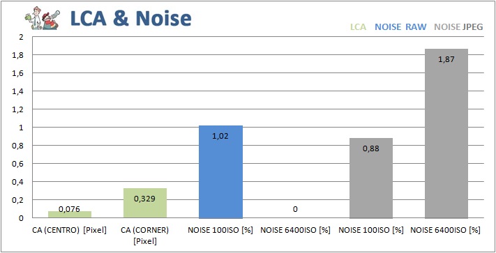L'aberrazione cromatica è sotto la soglia di visibilità. Per quanto riguarda il rapporto segnale rumore, vale esattamente quanto detto a proposito della risoluzione: molto buono per la categoria, ma c'è chi fa meglio - e si tratta sempre della Sony RX100 III.