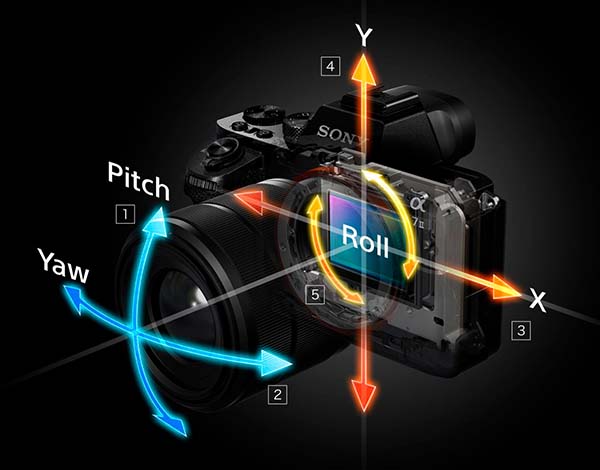 Eccellente, senza alcuna riserva, lo stabilizzatore integrato a 5 assi, che si occupa cioè di contrastare il mosso di tre tipologie diverse: beccheggio (1) e imbardata (2), cioè inclinazione dell'obbiettivo in alto/basso destra/sinistra; rollio (5), cioè rotazione della fotocamera intorno all'asse dell'obiettivo; traslazione X-Y parallela al piano del sensore (3), (4).