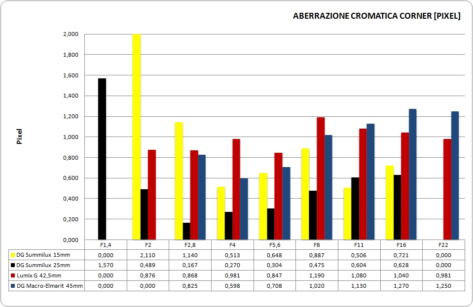 Il DG Summilux 15mm, penalizzato in questo test dalla ridotta nitidezza ai bordi, fa registrare punteggi che inducono a credere a una grave aberrazione cromatica a tutta apertura; in realtà, l'esame visivo mostra un quadro decisamente migliore: il vero problema è la nitidezza, non l'aberrazione cromatica. Buono il comportamento tra f/4 e f/16.