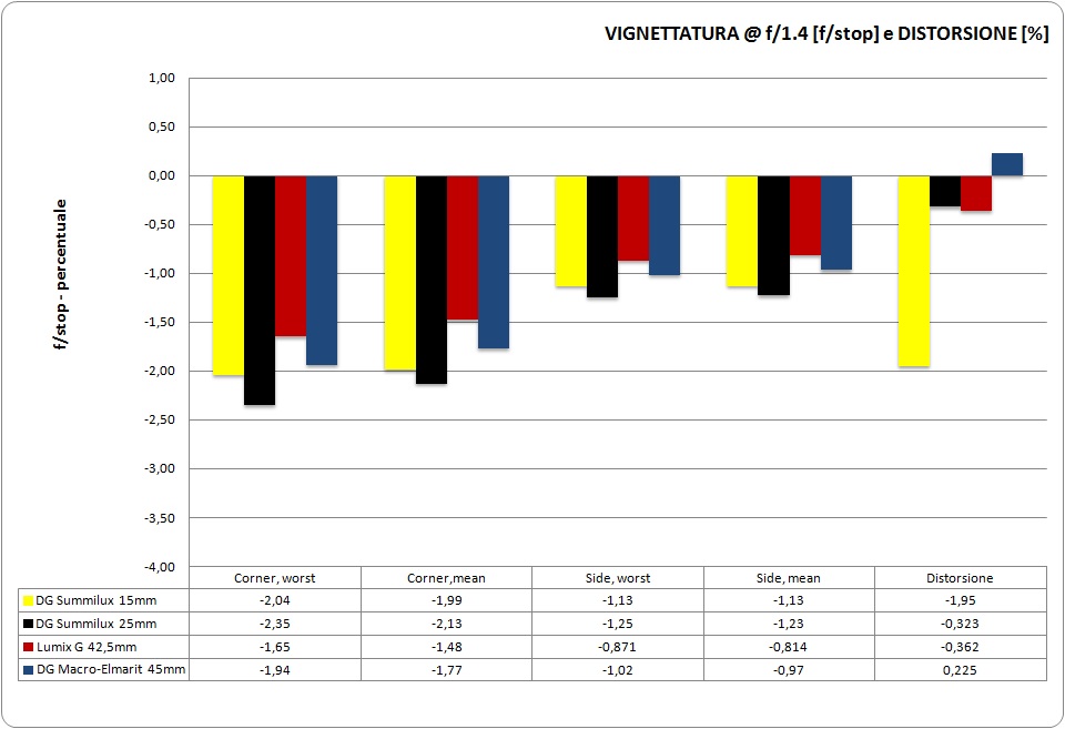 Il DG Summilux 25mm è, anche in questo caso, penalizzato dall'apertura più elevata del gruppo, che rende la vignettatura più evidente. Il valore è il più alto del gruppo, ma per un obiettivo con queste caratteristiche si tratta di un buon risultato. Per la cronaca, un eccellente obiettivo per il formato 35mm come il Sigma 50mm f/1.4 Art perde un massimo di circa 1.9 f/stop, e si tratta di un obiettivo che sfiora la perfezione. Leggera distorsione a barilotto.