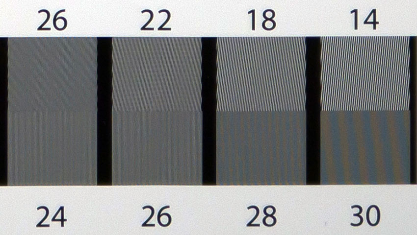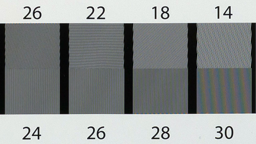 Nitidezza al centro, a f/5.6 (in alto) e alla massima apertura (in basso).