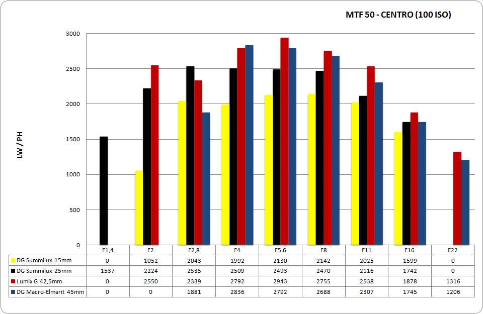 Il Lumix G 42.5mm si è dimostrato un eccellente obiettivo, spuntando tra l'altro il valore massimo assoluto: 2943 LW/PH a f/5.6. Eccellente anche a f/4 ed f/8, assicura comunque risultati molto buoni a qualsiasi valore di apertura, perdendo qualcosa solo a f/22 che, però, è un valore di apertura che altri obiettivi in questo gruppo non offrono nemmeno.