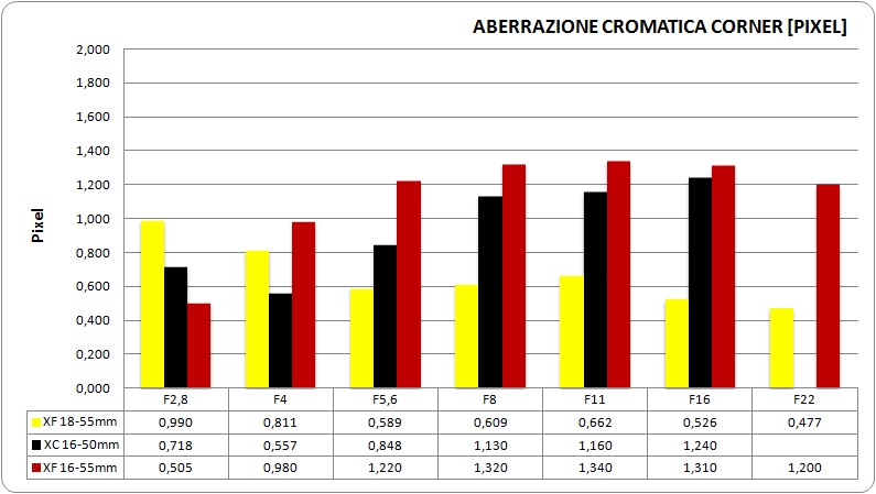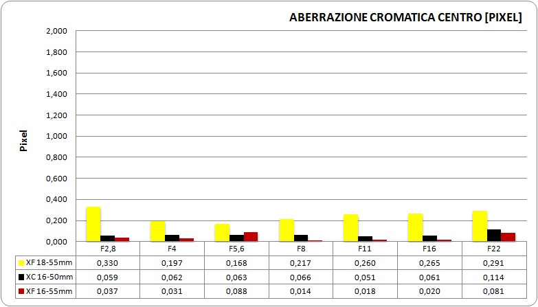 L'XC 16-50mm "naviga" sulla media del singolo pixel a quasi tutti i diaframmi disponibili, quindi si può parlare di difetto moderato e grossomodo costante. Stupisce, questa volta negativamente, l'XF 16-55mm che anch'esso mostra un'aberrazione visibile e che non si riduce chiudendo il diaframma. È questo sicuramente il suo peggior difetto - difetto che, però, fortunatamente, può essere corretto in modo semplice ed efficace dall'elettronica interna o in fase di post-produzione.
