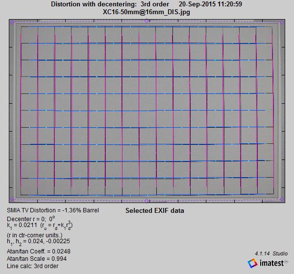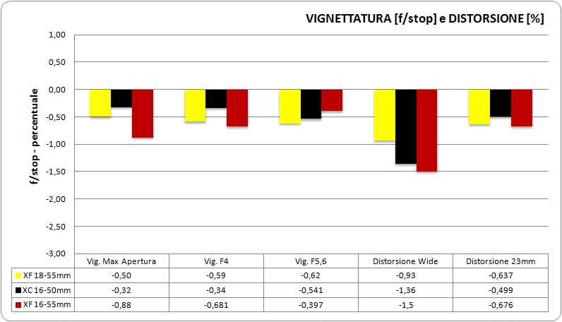 Lo stesso dicasi per le distorsioni. Se considerate alla minima focale, il 18-55mm è evidentemente avvantaggiato dalla focale superiore ai concorrenti, ma tra i due che partono da 16mm è l'economico XC 16-50mm ad avere la meglio.