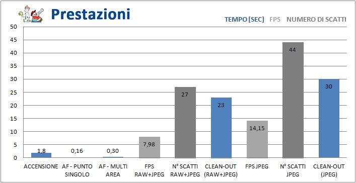 L'accensione è rapida, e la reattività generale del corpo macchina in fase di scatto molto buona. Lo scatto ad alta velocità risulta penalizzato dall'utilizzo del formato RAW, mentre lo scatto continuo standard, 5 fps, viene mantenuto a prescindere dal formato. Ottima la durata della raffica JPEG, ma il tempo di svuotamento del buffer è piuttosto elevato.