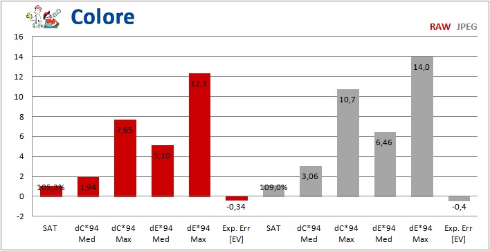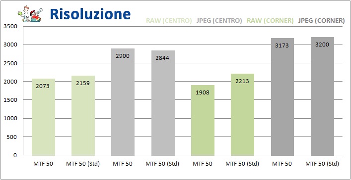 Il dato reale è, in questo caso, quello del RAW - comunque molto buono per una compatta. Il JPEG, sovra-elaborato, porta a una grande impressione iniziale di nitidezza e ad altissimi risultati numerici, a cui non corrisponde, però, un reale livello di dettaglio.