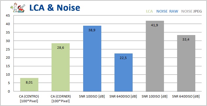 L'aberrazione cromatica (valore moltiplicato x100 ai fini di migliorarne la leggibilità) è molto contenuta per il RAW a qualsiasi focale, anche ai bordi; stranamente, emerge più nel formato JPEG, probabilmente a causa della lavorazione eccessiva del file. Buono il rumore a 100 ISO, mentre a 6400 ISO la RX10 II paga, inevitabilmente, i molti Mpixel concentrati in un'area realtivamente ristretta. Da notare, ancora una volta, la notevolissima elaborazione del file, sottolineata dall'enorme differenza tra il SNR del RAW non elaborato e del JPEG.