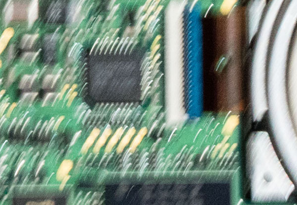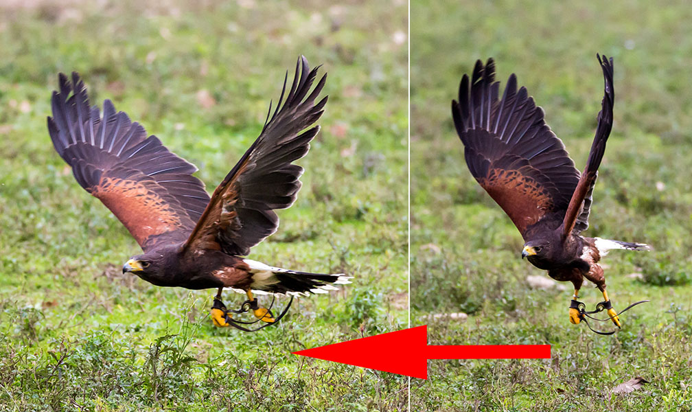 EOS 5Ds - Tamron SP 150-600mm @ 500mm, 1/500sec. In alto, stabilizzatore ON, in basso stabilizzatore OFF. Particolare al 100%. La regola dell'inverso della focale è stata qui sufficiente a catturare due scatti privi di mosso.