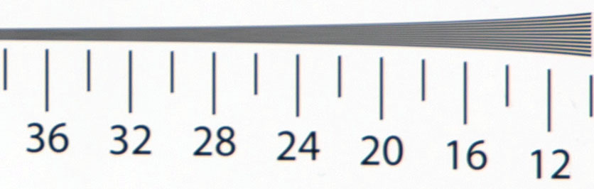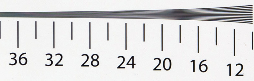 In alto: 300mm, f/8. In basso: 600mm, f/8- Alle sue focali intermedie, questo obiettivo è estremamente nitido al centro del fotogramma. A 600mm la nitidezza inevitabilmente si riduce, ma l'estinzione del pattern si osserva per circa 1750 LW/PH, che è ancora un dato molto buono. Il miglior diaframma, in termini di nitidezza, è f/8.