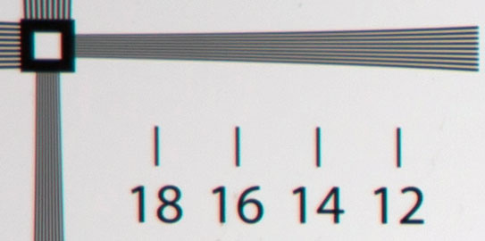 Agli angoli del fotogramma, la nitidezza si riduce molto. Il miglior risultato, praticamente costante da 300mm a 600mm e corrispondente a un dato di circa 1500 LW/PW, è quello mostrato qui sopra e si ottiene passando a f/11 o, in alcuni casi, anche a f/16.