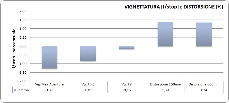 La vignettatura, visibile ma mai drammatica, si riduce rapidamente diaframmando anche solo 1 stop (il grafico si riferisce alla focale di 150mm). Valutazioni analoghe valgono per le distorsioni, visibili ma mai drammatiche, e sempre di tipo "a cuscinetto". Si riducono leggermente alle focali centrali, rimanendo però sostanzialmente costanti su tutta la gamma zoom.