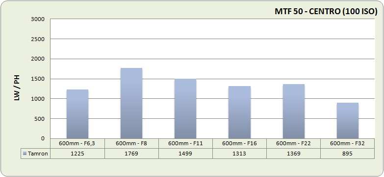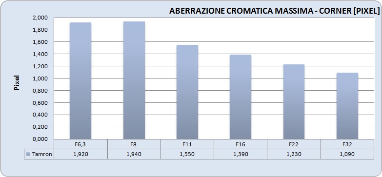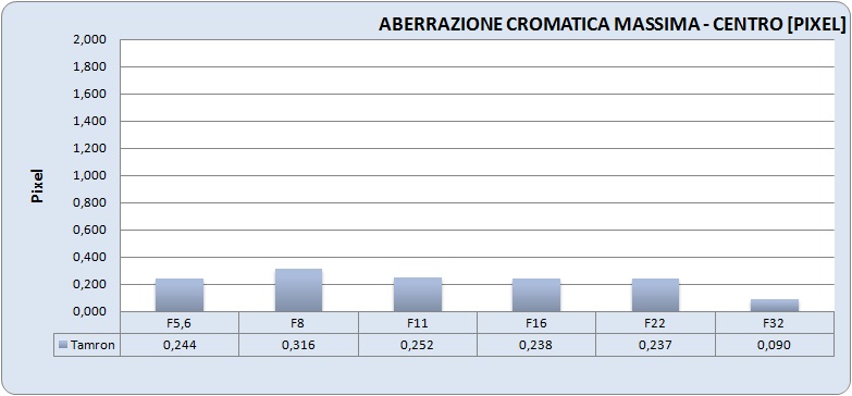 Risultando sempre inferiore al mezzo pixel, l'aberrazione cromatica al centro non pone alcun problema. Visibile invece ai bordi e alle focali superiori - il grafico qui sopra mostra il livello massimo, registrato a 600mm. Il difetto si può considerare grave solo a questa focale e ai due diaframmi più aperti, il che non è certo un cattivo risultato per un obiettivo che, lo ricordiamo, copre da 150 a 600mm costando su strada meno di 1000 Euro.